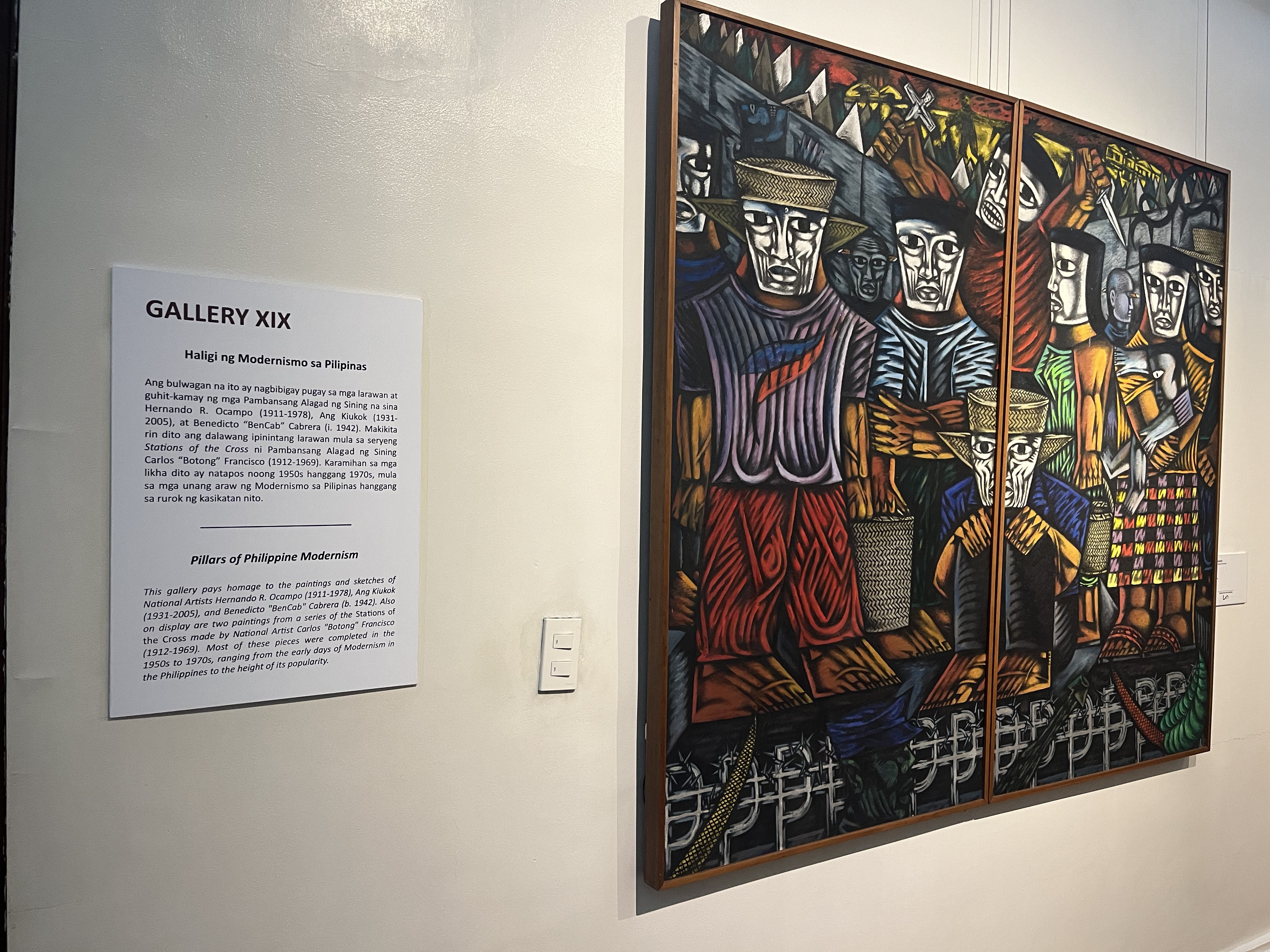 The Hiligaynon term, “Hulat Sweldo” means delayed wages. This work was produced by Nunelucio Alvarado, a social painter from Negros Occidental. In 1994, Alvarado created his two-panel oil on canvas to stand for the plights and efforts of sakadas or migratory farmworkers. There are the folks at its core, and this color palette makes use of earthy tones that symbolize the grit in the subject matter. This painter incorporates a very realistic approach to convey the subtle complexities of the workers' emotions, their outfits, and overall spirit. The brushstrokes show through and add a lot of texture to the planes, light-dark contrast aids in achieving the three-dimensionality of such a scene.